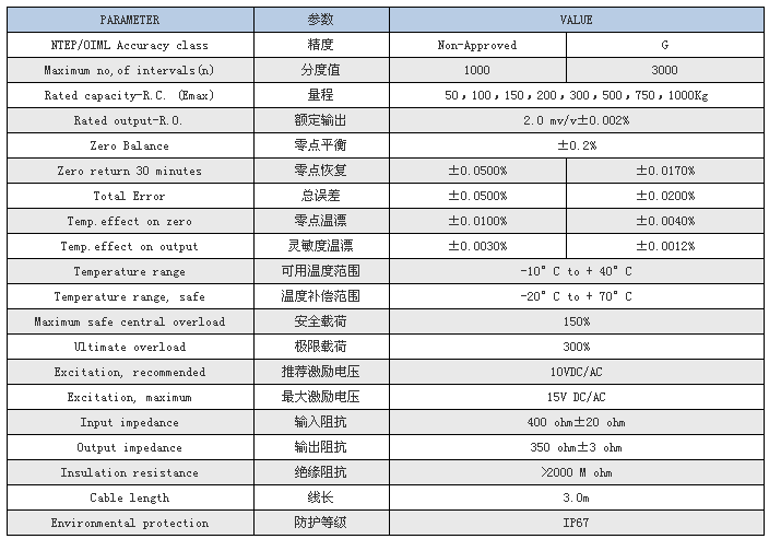 特迪亞615-750kg稱(chēng)重傳感器產(chǎn)品參數(shù)表: