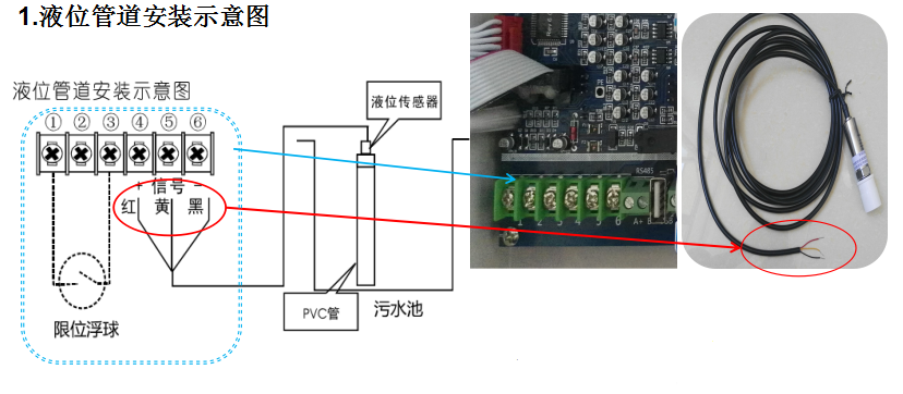 高度防止污泥諸塞,PVC管須固定在水池壁邊,防止晃動 (注意液位傳感器線顏色及對應端口)