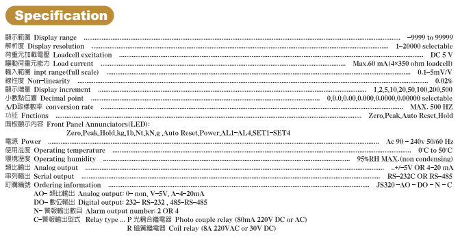 臺(tái)灣JIHSENSE JS-300稱(chēng)重顯示控制器規(guī)格: