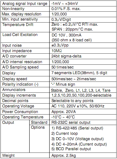 韓國(guó)Bongshin BS7300XL稱重儀表技術(shù)指標(biāo)