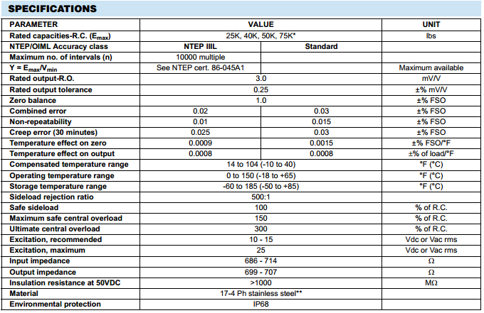 描述:Stainless Steel Shear Beam Load Cell Welded Seal Double-Ended Sensortronics Model 65040W has rated capacities of 25,000 to 200,000 lbs., with a welded seal, stainless steel construction and is Factory Mutual System Approved for Classes I, II, III; Divisions 1 and 2; Groups A through G.