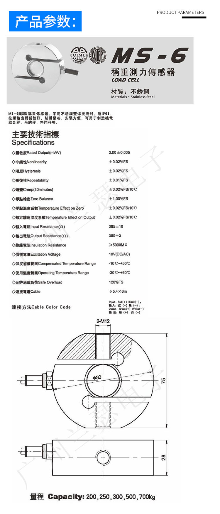 美國(guó)AC S型MS-6稱(chēng)重傳感器產(chǎn)品參數(shù):