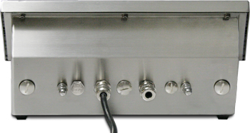 3590EGT背視圖:標配帶保護罩的PC串口、用于調(diào)節(jié)儀表內(nèi)部壓強的調(diào)節(jié)閥、230Vac電源插頭、連接秤臺的導纜孔及4個預留孔。標配的保護罩密封性良好,且材質(zhì)均為不銹鋼。