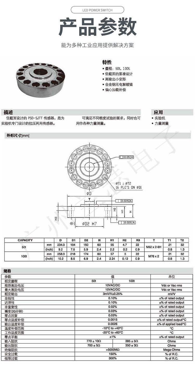 美國Celtron PSD-50tSJTT,PSD-100tSJTT稱重傳感器產(chǎn)品參數(shù):