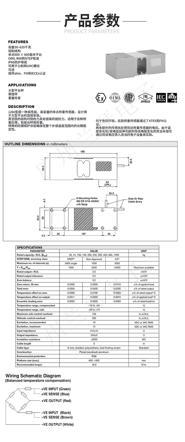 美國Tedea 1260-200kg稱重傳感器產(chǎn)品參數(shù):