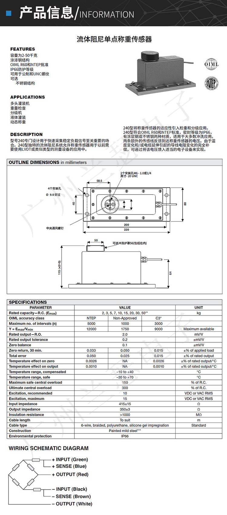 美國Tedea 240-5kg稱重傳感器產品參數: