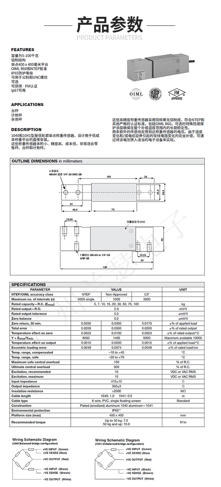 美國Tedea 1040-5kg稱重傳感器產(chǎn)品參數(shù):