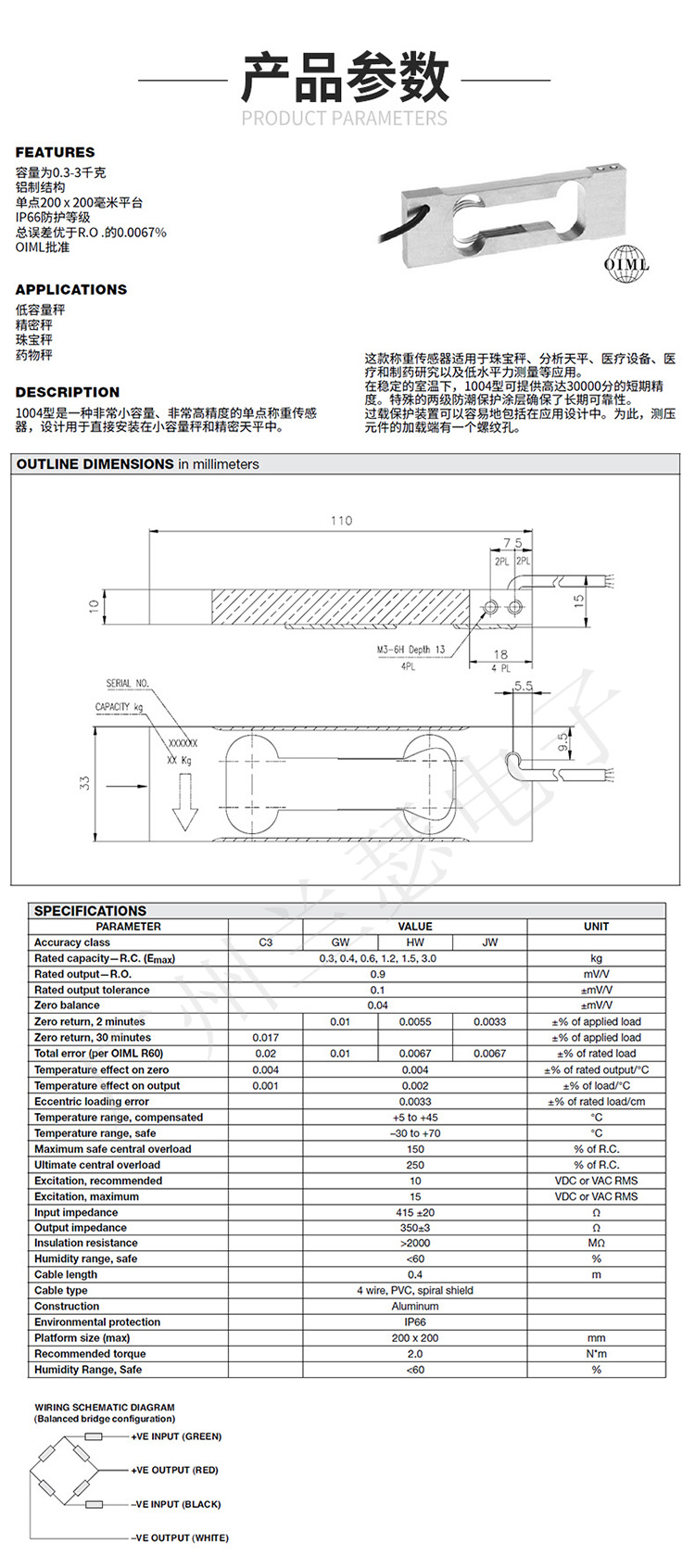 美國Tedea 1004-0.6KG稱重傳感器產(chǎn)品參數(shù):