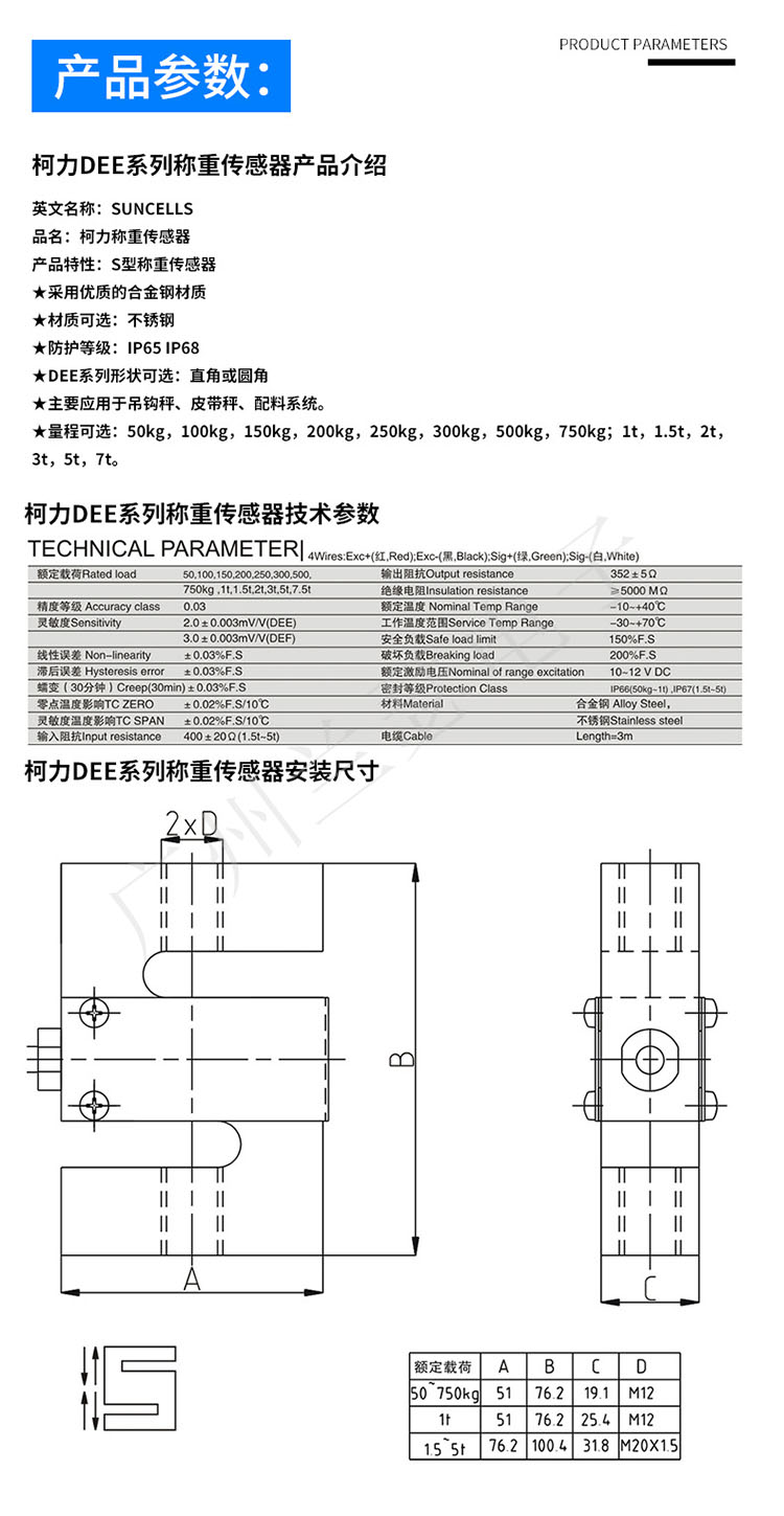 S型傳感器;DEE-250KG傳感器優(yōu)質(zhì)合金鋼材質(zhì);安裝簡便、快速 ,穩(wěn)定可靠;美國SUNCELLS DEE-250KG傳感器適用于材料試驗機、配料秤、攪拌站、皮帶秤和包裝秤等;