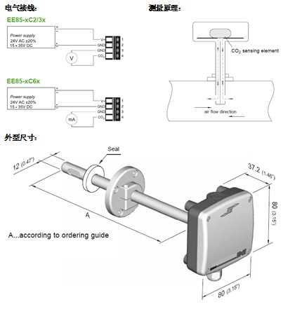 EE85的測量范圍為0...2000/5000/10000ppm,對應(yīng)的模擬輸出方式可選標(biāo)準(zhǔn)的0...5V/10V DC或4...20mA信號,也可以選擇帶設(shè)定報警點和回差點的開關(guān)量信號輸出方式。使用標(biāo)準(zhǔn)的安裝法蘭,可以方便地將變送器安裝在風(fēng)道上。