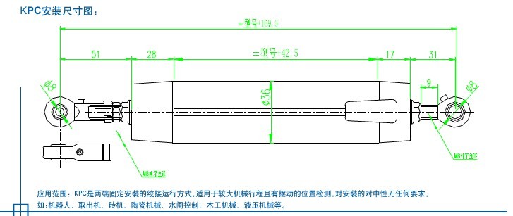 KPC絞接式電子尺,有效行程75mm~1000mm,兩端均有4mm緩沖行程,精度0.05%~0.04%FS。外殼表面陽極處理,防腐蝕;內(nèi)置導(dǎo)電塑料測量單元,無溫漂,壽命長;具有自動電氣接地功能。KPC絞接式位移傳感器可適用在大多數(shù)通用場合,特別適用產(chǎn)品本體不能固定,擺動運動的場合,無需對中;允許極限運動速度:垂直安裝時為10m/s,水平安裝時為3m/s。