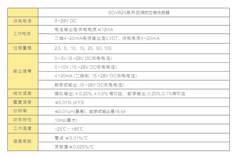 SOWAY SDVB20直流回彈式位移傳感器參數(shù)介紹: